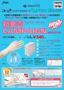 【キャンペーンのお知らせ】歯科用ディスポーザブルグローブ「シンテックスグローブ」 2026.03.13 キャンペーン このたび、合成ゴム製ディスポーザブルグローブ「プロプラス シンテックスグローブ」の発売を記念し、期間限定のキャンペーンを実施いたします。 天然ゴム手袋のような優れたフィット感と操作性を持ちながら、ラテックスアレルギー対策にも配慮した新素材グローブです。柔らかく手にぴったりフィットし、細かな作業が求められる歯科診療でも快適にご使用いただけます。 ぜひこの機会にお試しください。 キャンペーン期間 2026年3月21日 ~ 2026年5月20日